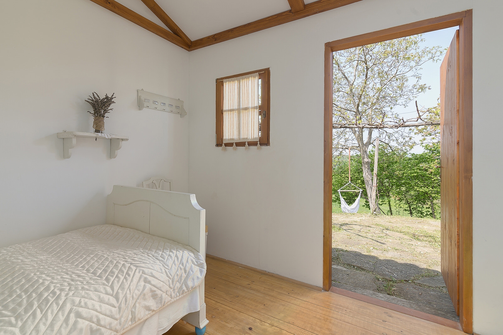 MLEKARICA: Hiška Mlekarica ima zakonsko posteljo in eno posteljo ter je primerna za 3 osebe. Pred hiško so mize, stoli, ležalniki in viseče mreže.